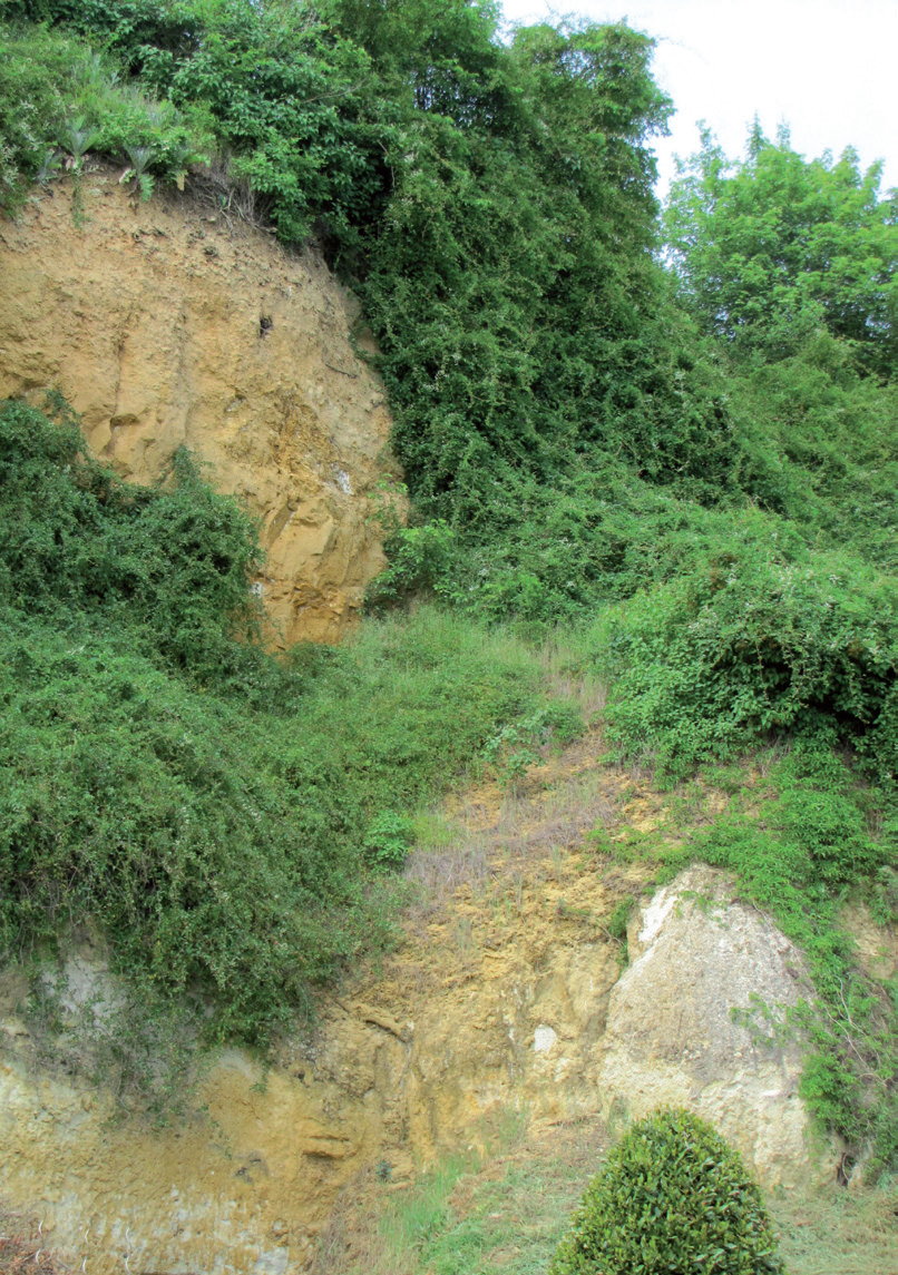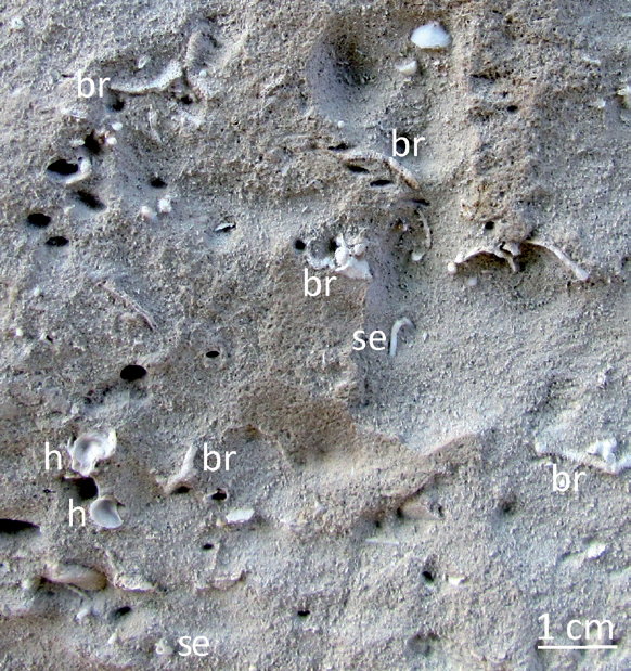 La roche s’est déposée en milieu marin sur la plate-forme continentale de la "Mer de la Craie" vers une profondeur de 100 m. Quartz et mica proviennent de l’érosion de roches silicatées des terres du Massif armoricain proche.