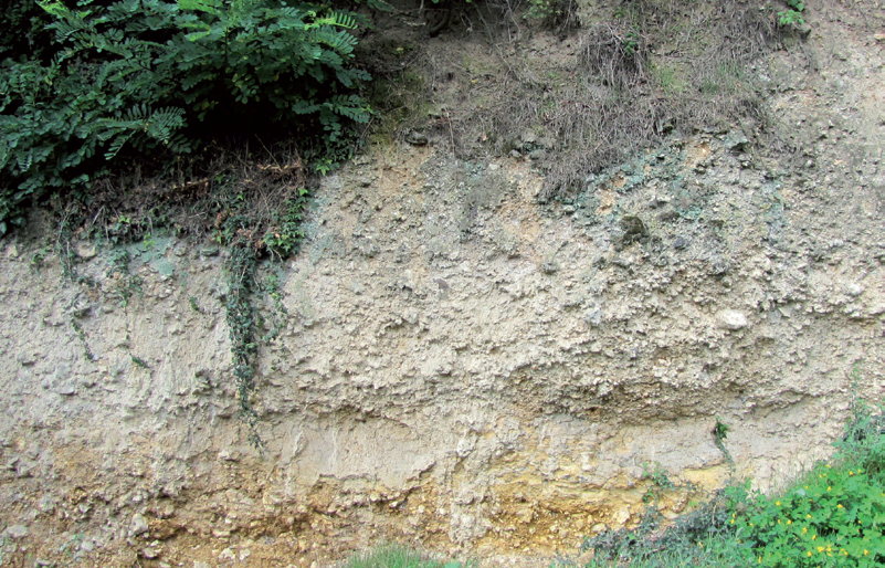 Tranchée de la rue de la Garde : affleurement de l’Argile à silex, produit d’altération de la craie sénonienne.